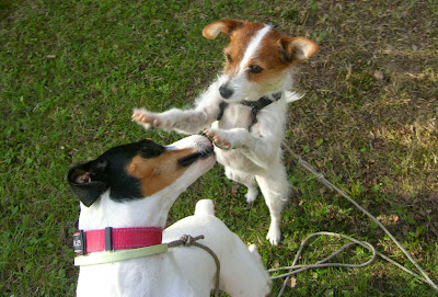 Moo on alkanut harjoitella Timmyn kanssa piha-agilitya. Timmy rakastaa sitä! Hyppäämistä kivelle ja esteiden yli. Mommy vähän hyppyytti minuakin, ja aika nopsaan opinkin hyppäämään käskystä kivelle ja esteenkin yli. Timmy on kuitenkin vähän miellyttämishaluisempi kuin minä, joten se vähän paremmin tekee, mitä käsketään.